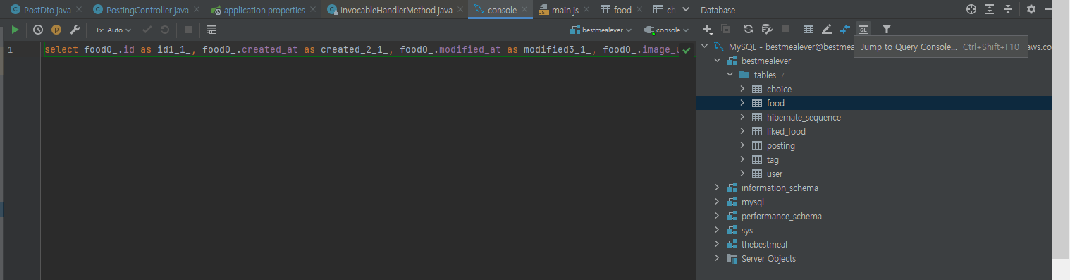 이건 Internal server error 임. 이 코드에서 멈춰서 해결이 안되었다. food 객체에서 문제가 있다는 것(즉 food 가 중복되고 있다는 뜻이다) 알고보니 아래 food 2가 고유값이어야 하는데, (getPostingFoodName)을 기준으로 찾아오니까. 여러값을 찾아서 서버가 이게 뭐지? 하고 혼란스러워하고 있다.