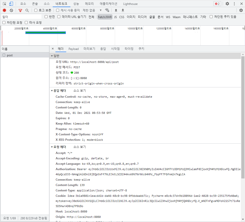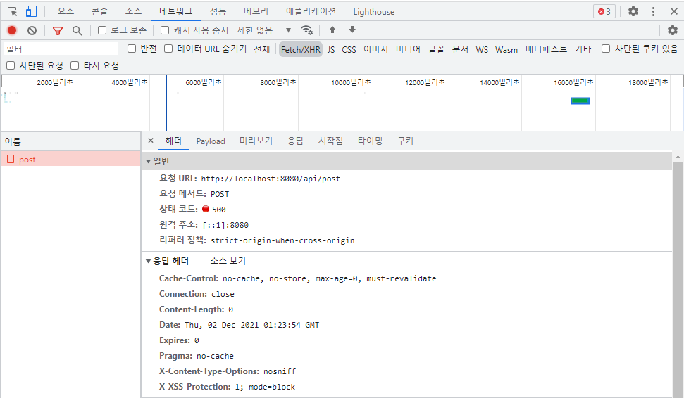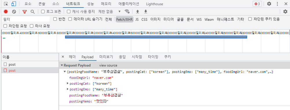 (2) 프론트 단에서는 콘솔 -> 네트워크 -> post ->