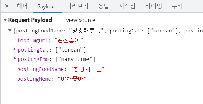 front 와 서버단의 객체 데이터가 일치한다. Payload로 보면 console.log를 일일이 안찍어도 되서 편하다.