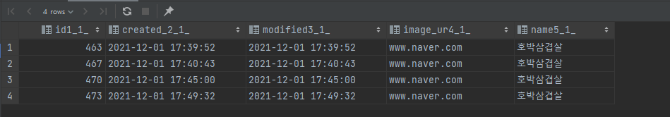 select food0_.id as id1_1_, food0_.created_at as created_2_1_, food0_.modified_at as modified3_1_, food0_.image_url as image_ur4_1_, food0_.name as name5_1_ from food food0_ where food0_.name='호박삼겹살'