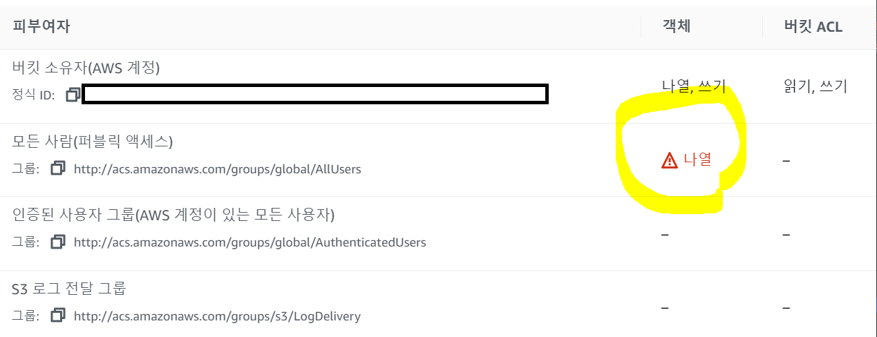 이렇게 설정을 바꿔주니, 이미지가 h2 db에 잘 저장이 되었다. 글에도 이미지 반영이 되었고, url 을 직접 접속해도 이미지가 잘 보인다. 하지만 s3에 파일이 쌓이지 않는다. 퍼블릭 액세스가 되지 않아서 그렇다(url에는 액세스가 되어서 잘 받아오지만, s3 버킷 객체에는 접근이 막혀서 그랬었던 것 같다. 여기 객체에 나열(List) 권한을 주자. write 와 list 의 차이는 나중에 확인해보자.