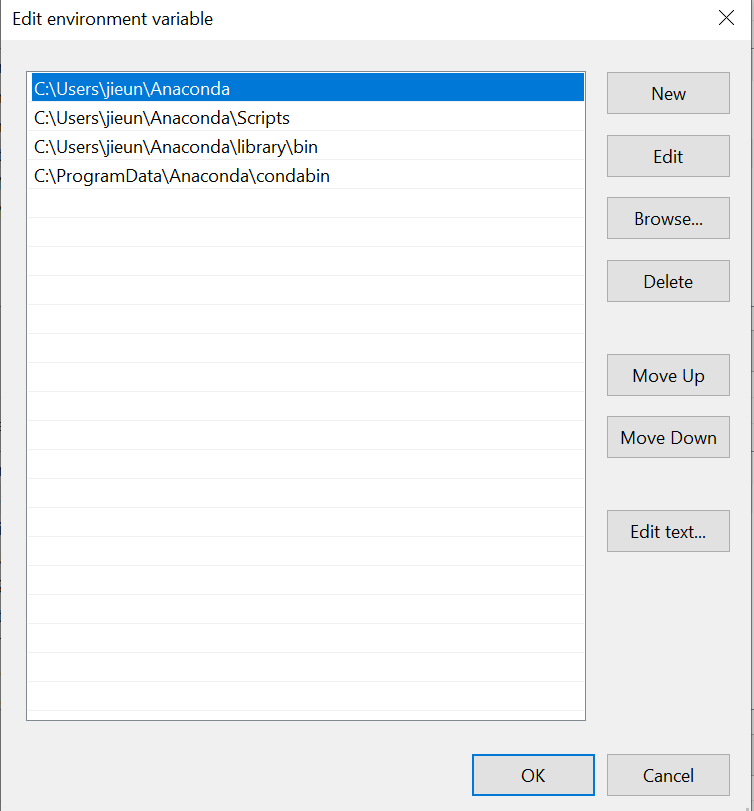 Anaconda 가 설치되어 있는 경로를 직접 더해줍니다.