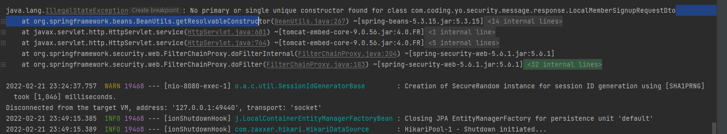 No primary or single unique constructor found for class LocalMemberSignupRequestDto 라고 나온다. 기존에