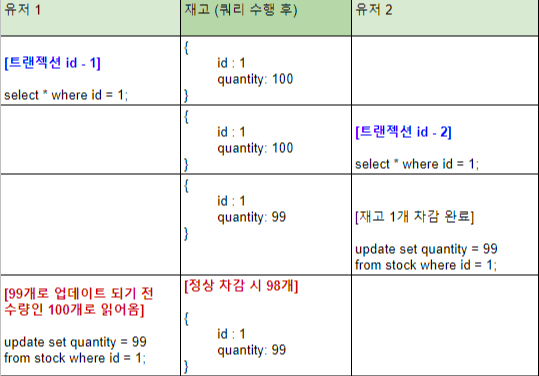 트랜젝션으로 묶었다면, ACID 중 격리성을 보장될 것이라고 기대했습니다. 하지만 여러 스레드가 접근하는 상황에서는 동시성이 보장되지 않는 것 같습니다.