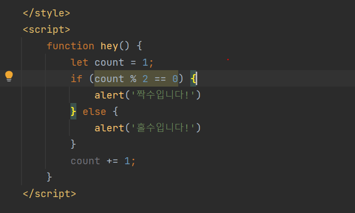 let count = 1; 을 앞에 넣어버리면, count +=1; 로 카운트 업을 시키더라도 다시 1로 돌아간다. 여러 번 클릭을 해도 한 번으로 인식해서, 계속 '홀수입니다' 라고 나온다.