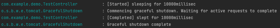 5초 간의 타임아웃 이후에도 여전히 bean 이 살아있다. 따라서 하나 이상의 요청이 살아있기 때문에, Graceful shutdown 이 중단된다. 즉, 살아있는 요청을 완료하는 걸 우선시하기 때문에, 데이터 손실이나 정합성이 깨지는 것을 막을 때 유리하다.