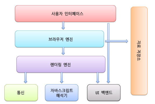 - 렌더링 엔진 - 요청한 콘텐츠를 브라우저 화면에 표시. 예를 들어 HTML을 요청하면 HTML과 CSS를 파싱하여 화면에 표시함.