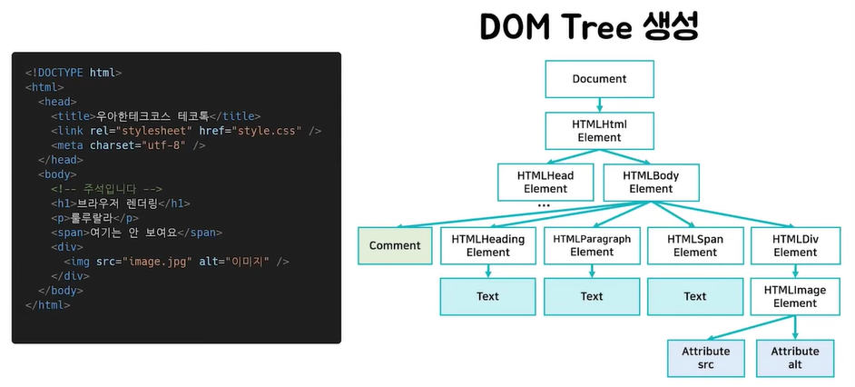 (2) 브라우저 렉싱 과정을 거치면서, 토큰이 해당 속성, 규정 정의하는 노드 객체로 변환됨. 각 노드가 서로 연관성 가질 수 있도록, DOM Tree 생성 . HTML 의 모든 요소는 DOM TREE 를 생성
