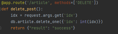같은 DELETE METHOD를 지닌 app.route 에서 idx 라는 key 정보과 함께 요청을 받고, DB 와도 통신해서 데이터를 지워줍니다.