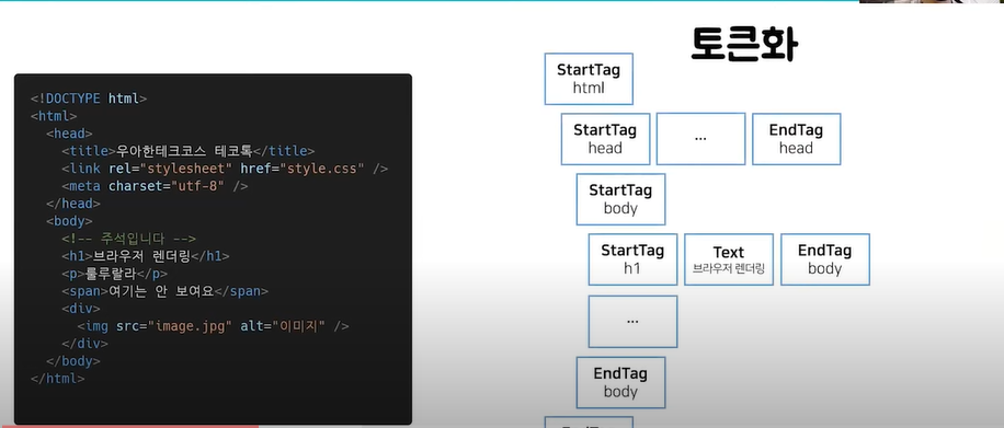 (1) DOM 트리 구축을 위해 HTML을 파싱. HTML 5에 지정된 표준에 따라서 고유한 토큰으로 변환. (ex. start Tag: HTML이 시작한다는 뜻)