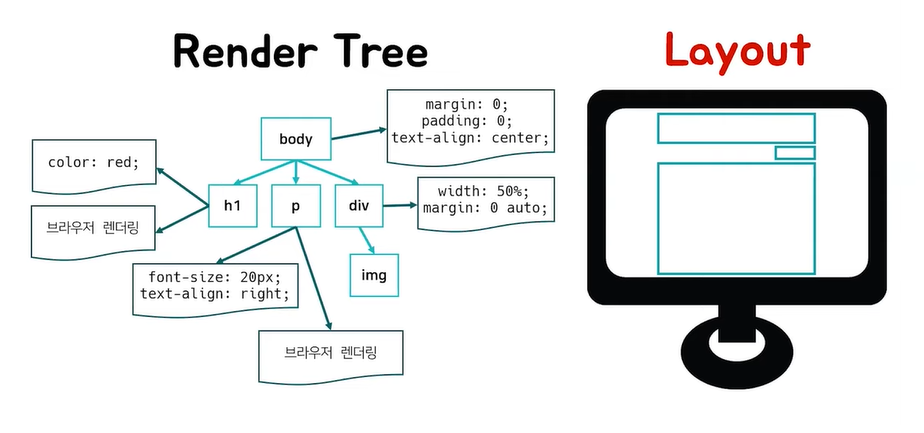 렌더트리는 DOM TREE + CSSOM TREE 가 더해진 개념. DOM 객체 노드를 위에서부터 순회하면서, 각각에 맞는 CSSOM 찾아서 규칙 적용.
