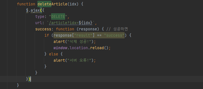 아래 예시에서는 자바스크립트에서 deleteArticle 이라는 요청을 서버에 보내고 있습니다 (type: DELETE).